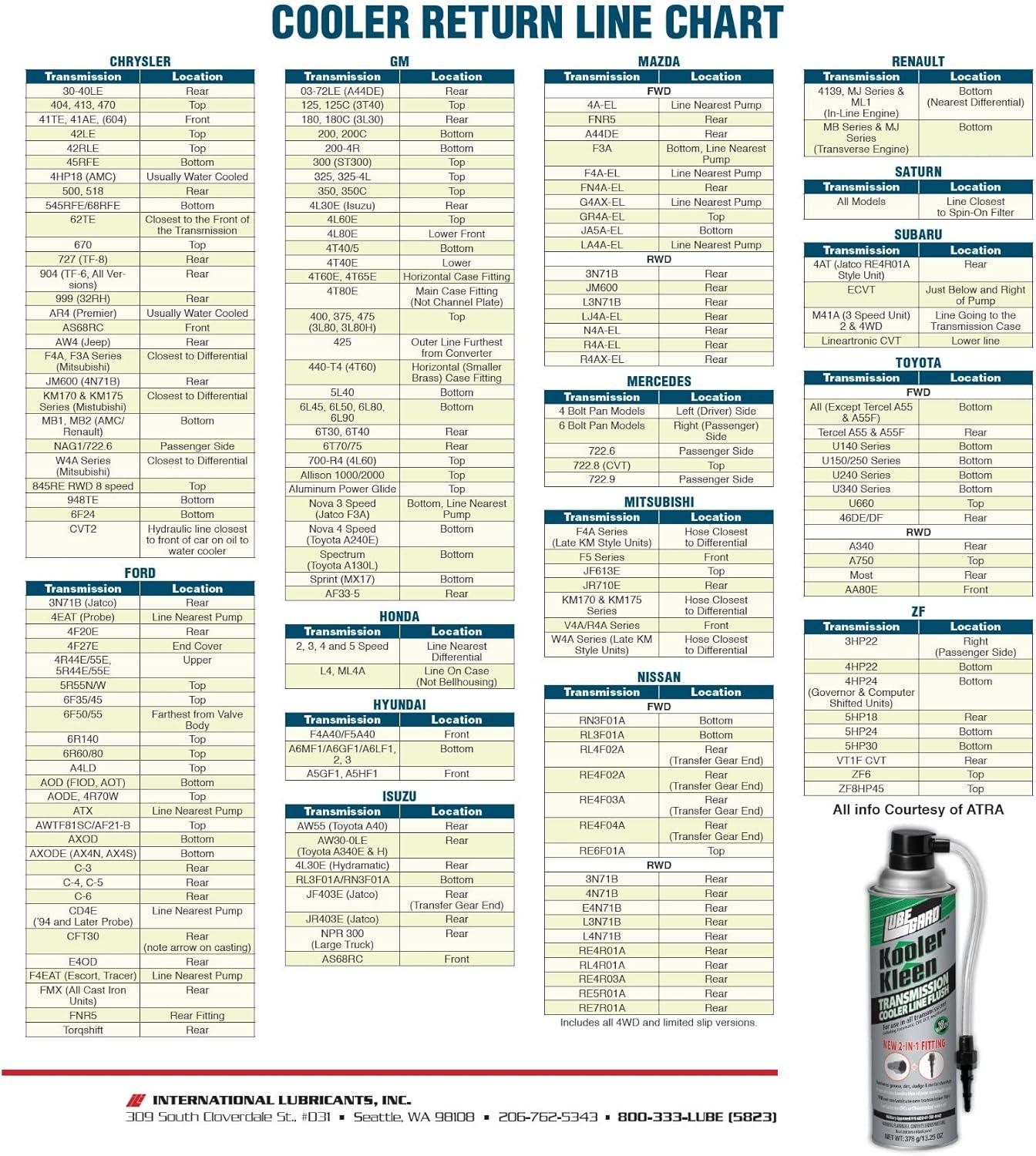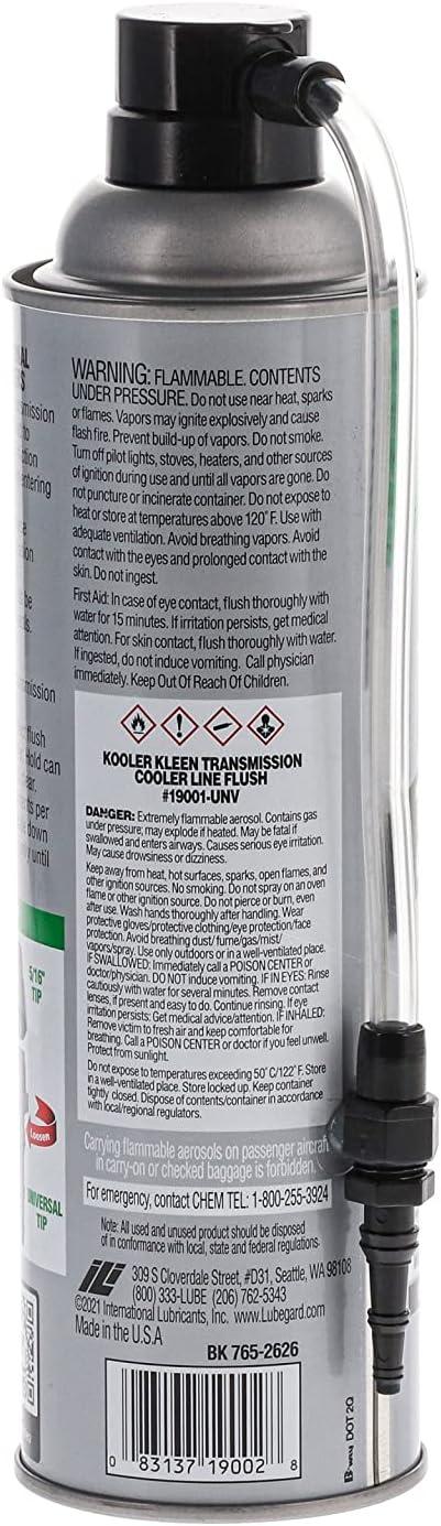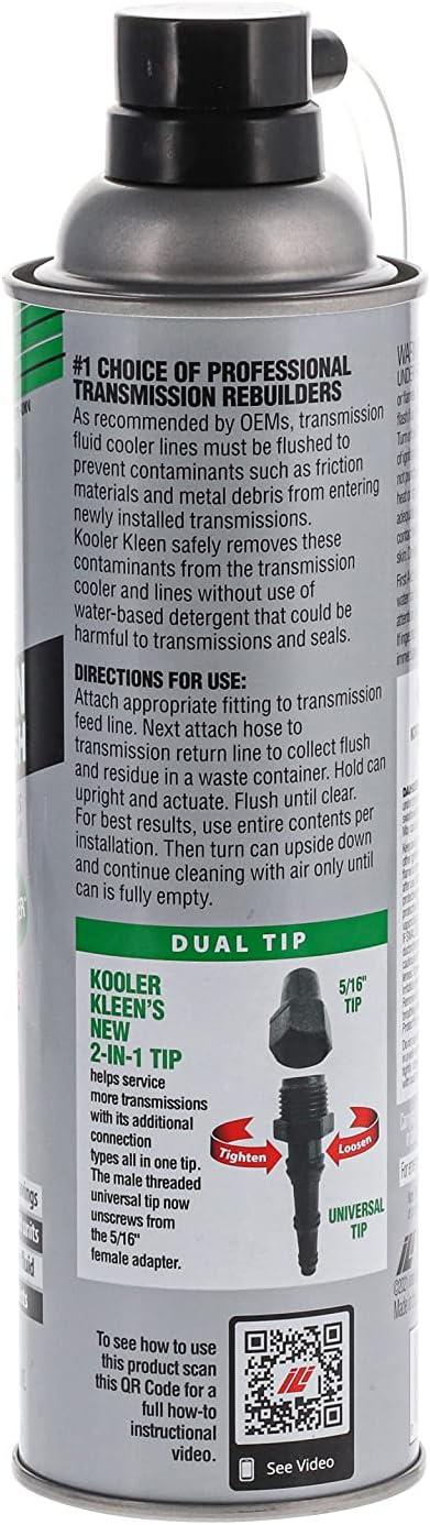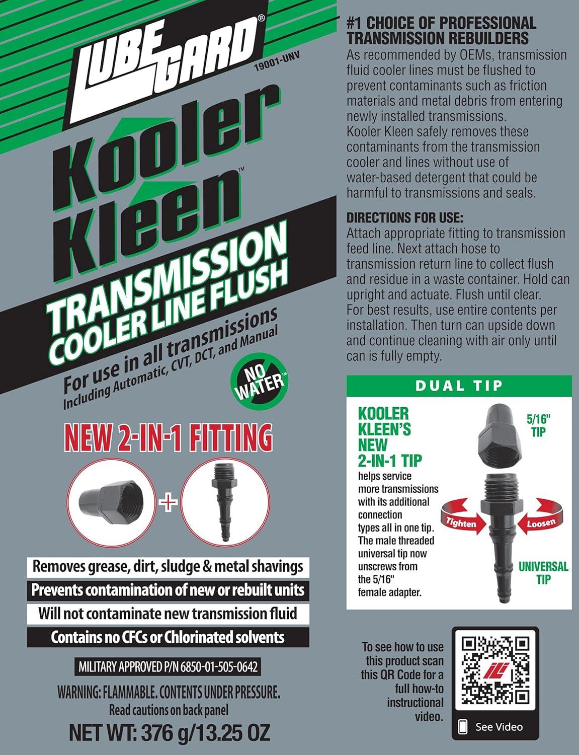 LUBEGARD Kooler Kleen Trans Cooler Flush uses a proprietary mix of detergents to safely clean transmission cooler and cooler lines in automatic, CVT, DCT and manual transmissions. As recommended by OEMs, transmission fluid cooler lines MUST BE flushed to prevent pollutants such as friction materials and metal debris from entering newly installed transmissions. Kooler Kleen safely removes these pollutants from the transmission cooler and lines without use of water-based detergent that could be harmful to transmissions and seals.