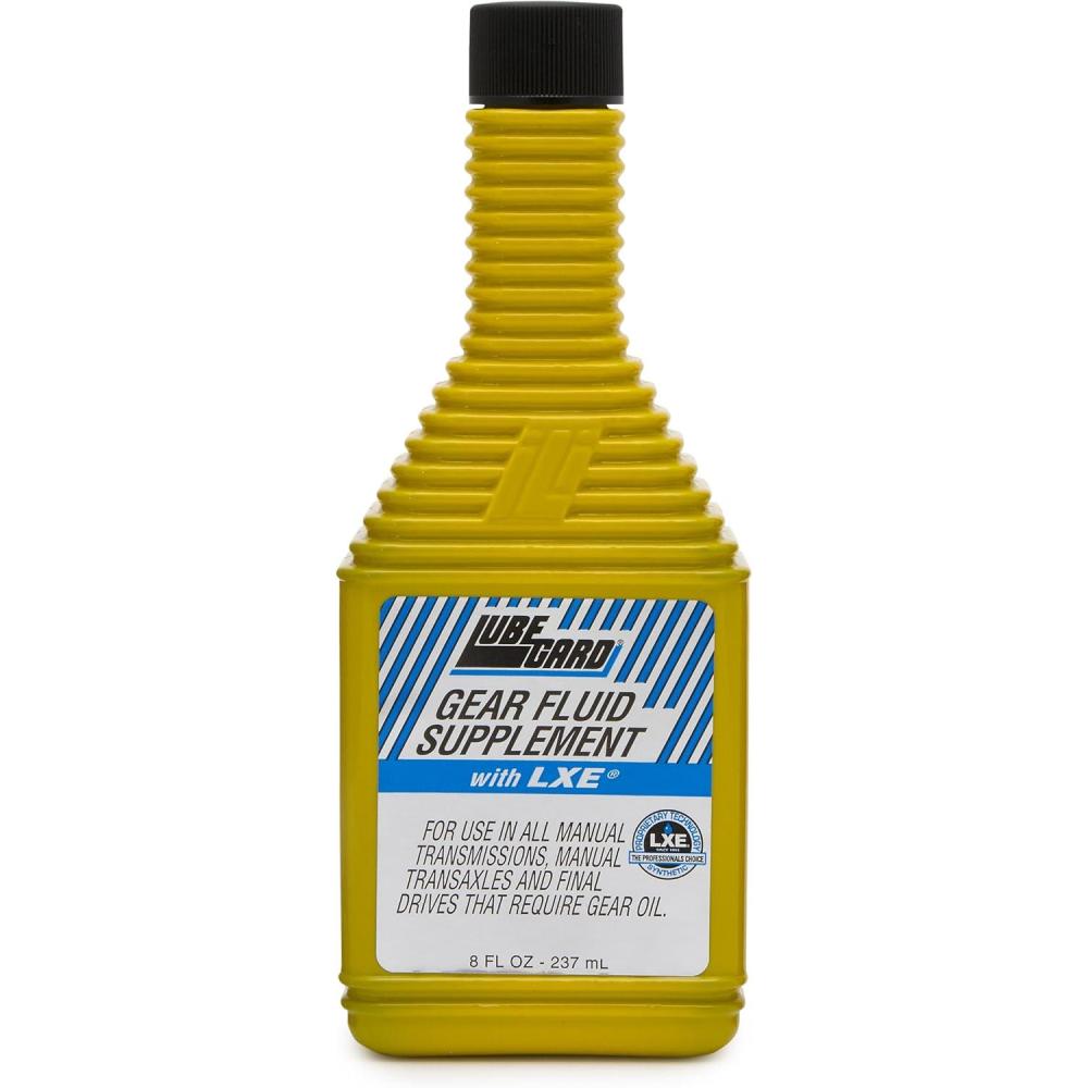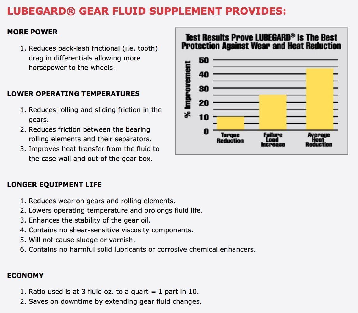 LUBEGARD GEAR FLUID SUPPLEMENT is designed for use in all manual transmissions, transaxles and final drives that require gear oil. LUBEGARD contains LXE, (liquid wax esters) and their derivatives, a blend of high grade petroleum oil, synthetic base oils and a complete anti-wear formula. LUBEGARD is designed to provide high temperature stability to prevent harmful deposits on synchros and gears. BENEFITS: Reduces drive train power loss, Lowers temperature and extends fluid life, Improves heat transfer from the fluid to the case wall and out the gear box, Improves all cold weather stiffness, Improves all manual & synchromesh transmission shifting characteristics, Reduces tooth drag and absorbs shock loads, thus improves the life of all gear units, Lowers friction on bearings and gears with high wiping stresses, especially hypoid gears, Minimizes oxidation and varnish deposits, Suppresses lubricant foaming, Safe for new MTF Fluids, Increases power transfer, reduces energy consumption and Decreases equipment operating and maintenance costs. DIRECTIONS FOR USE: Add 3 fluid oz. to each quart of gear fluid.