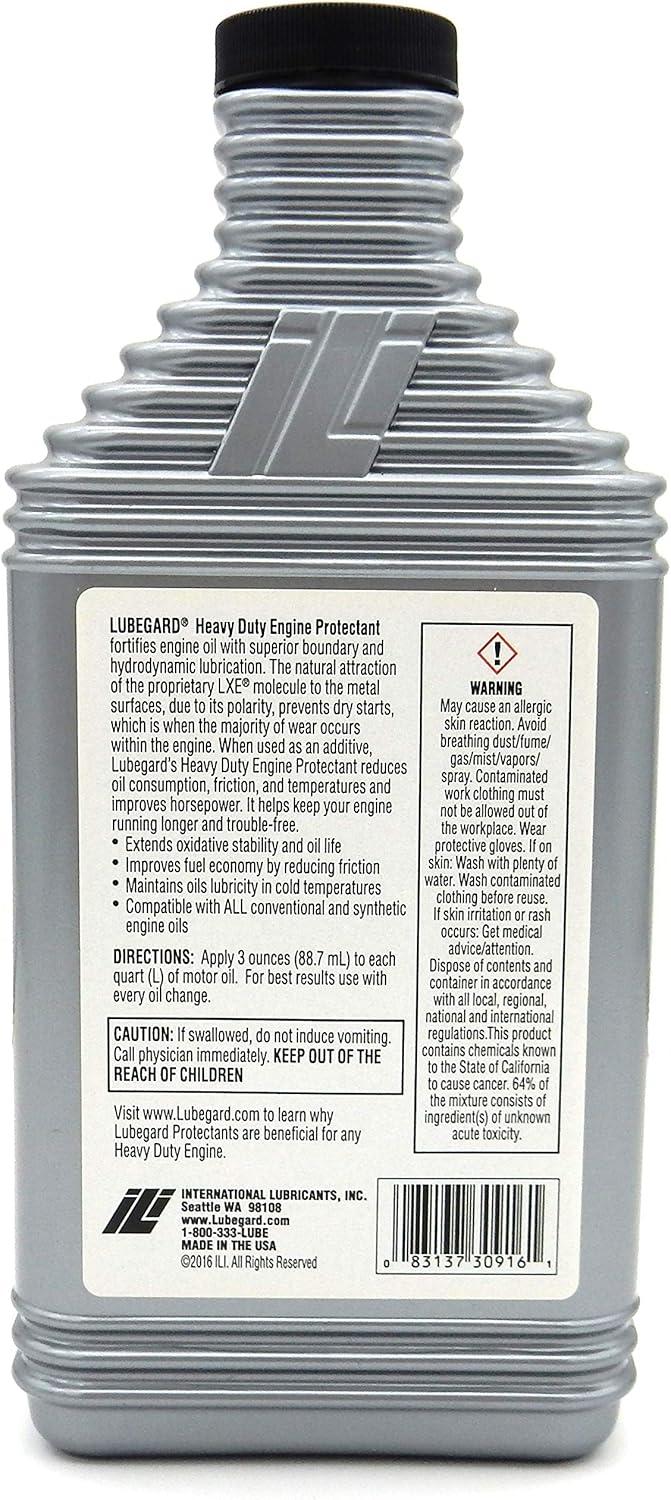 LUBEGARD HEAVY DUTY ENGINE PROTECTANT contains Liquid Wax Ester (LXE) Technology, specifically formulated to minimize friction and wear — keeping the oil cooler in today’s more complex engines. All modern engine oils contain a highly refined petroleum or synthetic base oil which is fortified with additives to meet motor oil performance specifications. Even so, dated specifications may not represent the level of performance needed by a new engine design. A new oil may not contain sufficient additives such as ANTI-WEAR agents or ANTI-CORROSION compounds even though it passes all the tests. Furthermore, these protective compounds are depleted when the oil is in service. The solution to this protection gap is LUBEGARD Heavy Duty ENGINE PROTECTANT which supplements and enhances the effectiveness of the additive system already present in the oil. LUBEGARD replaces the depleted or insufficient additives and adds LXE wear protectors and friction reducers which are unavailable in any oil. Minimum friction means maximum mileage; minimum wear means maximum service. In addition, LUBEGARD increases the thermal and oxidative stability of motor oil to prevent creation of sludge and deposits. There is a need for improved oil additives for protection and mileage in view of the rapid technological changes in modern engine design. LUBEGARD provides a concentrated package that fulfills these deficiencies (without adding ZDDP, chlorine, inappropriate sludge-building additives, or solid lubricants such as Teflon, graphite, or molybdenum disulphide.) LUBEGARD with LXE Technology will carry your engine through to the future! DIRECTIONS FOR USE: Apply 3 ounces (88.7 ml) to each quart (946 ml) of motor oil. For best results use with every oil change.