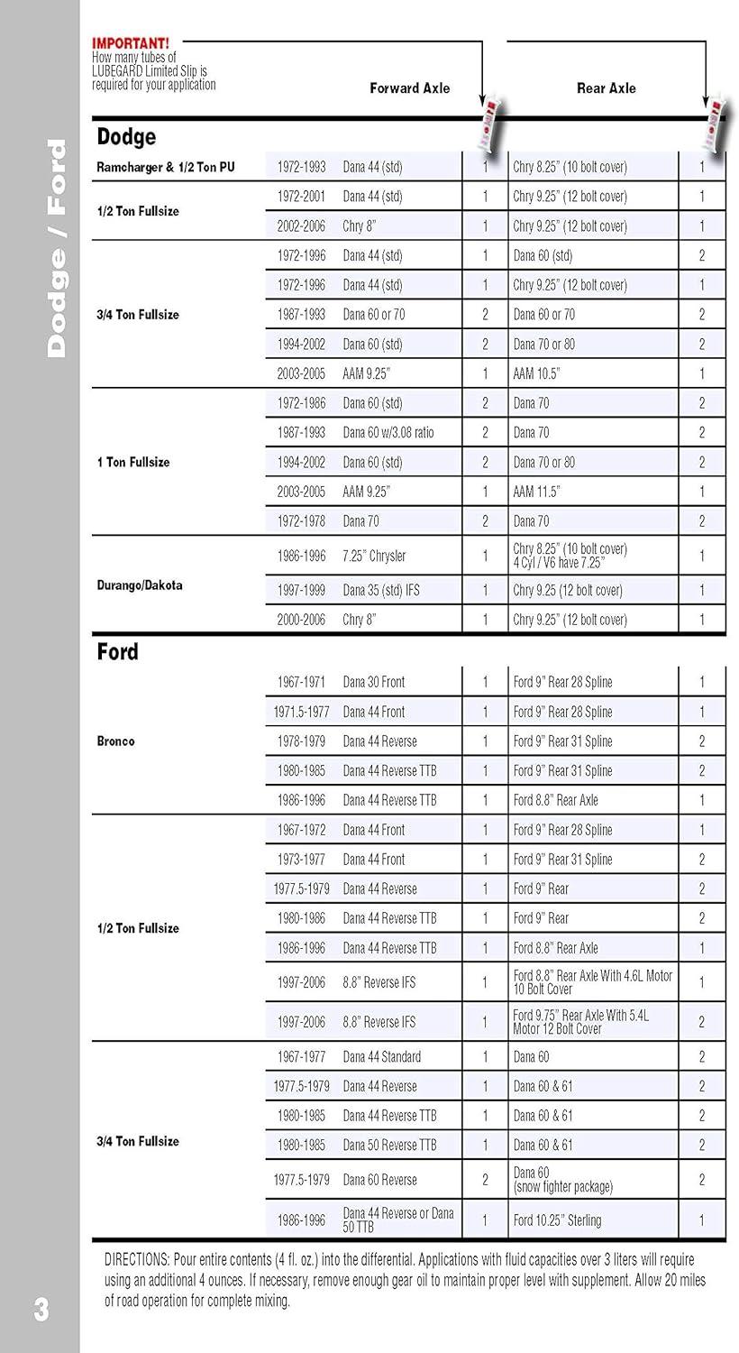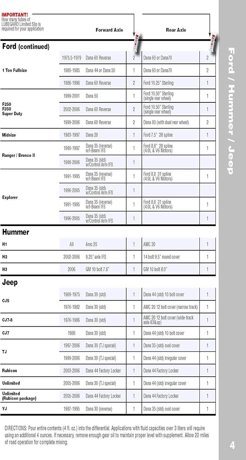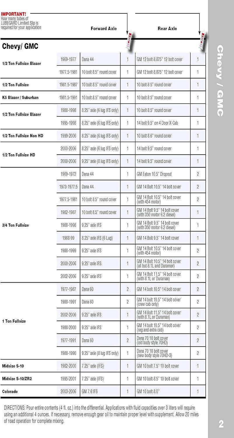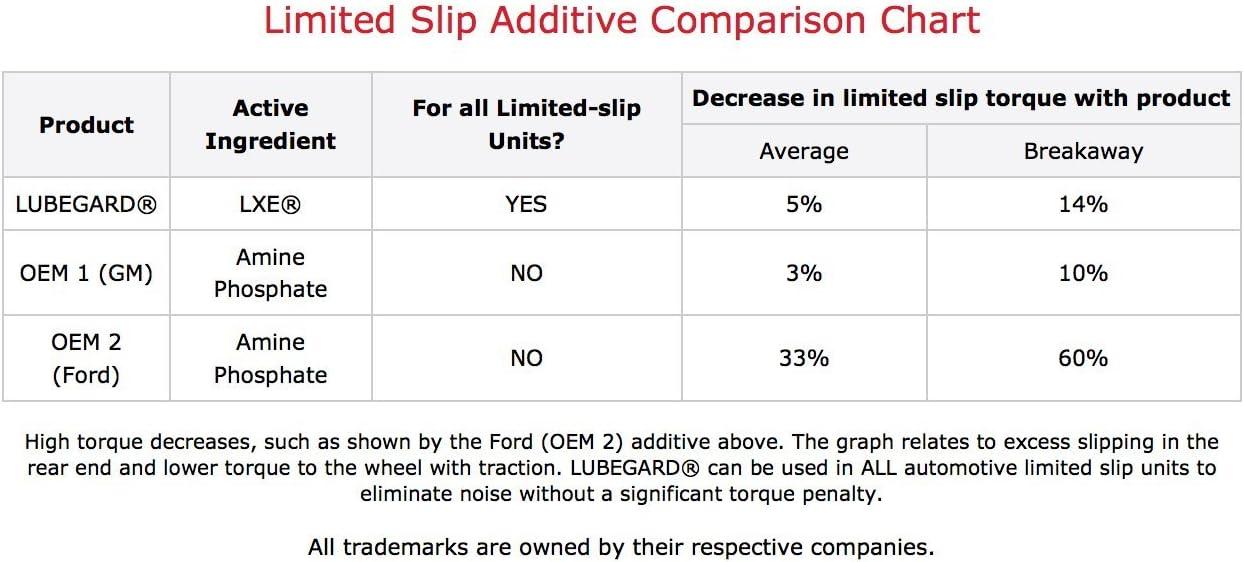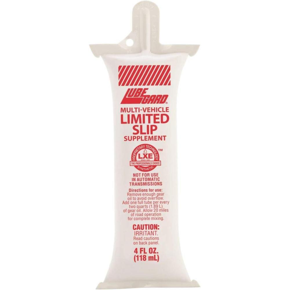 Lubegard Limited Slip Supplement is a universal limited slip supplement that eliminates differential chatter, reduces temperatures, extends clutch pack and equipment life in any limited slip differential. It also reduces differential temperatures and extends clutch pack and equipment life. It is specifically formulated for the clutches in limited slip differentials. They depend on the operation of pre-loaded clutch packs on each axle shaft. Gear oils made for standard differentials do not contain the additives that make these clutches work. The Lubegard limited slip supplement contains patented and synthetic LXE (liquid wax ester) technology, an advanced friction modifier to eliminate chatter. It contains rust and corrosion inhibitors to protect bearings and gear surfaces. The LXE technology also acts as an enhanced heat transfer component to pull heat out of the gear box and clutches more quickly providing cooler running units. The Lubegard limited slip supplement benefits all makes of vehicles with limited slip differentials including GM, Ford and Chrysler. DIRECTIONS FOR USE: If necessary, remove enough gear oil to maintain a proper level with the addition of LUBEGARD Limited Slip Supplement. Holding tip closed, cut off tip end, add entire contents of the LUBEGARD tube (4 fl. oz) into the clutch type limited slip differential. A 4 oz tube will treat a standard 2 qrt system. For larger capacities, follow a treat rate of 2 oz of Lubegard for every quart of differential fluid. For use with synthetic gear and differential oils a double treat rate of 4 oz per quart will provide the most optimum results. Allow 20 miles of road operation for complete mixing.