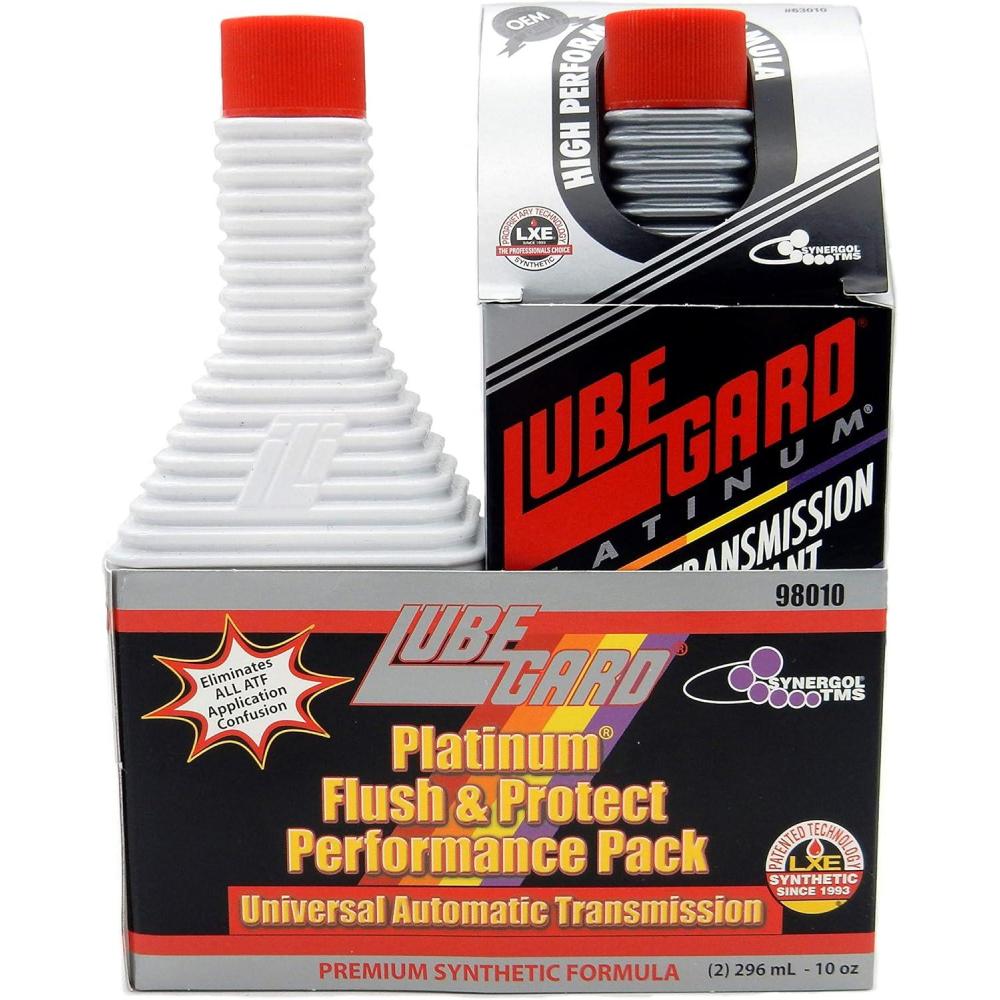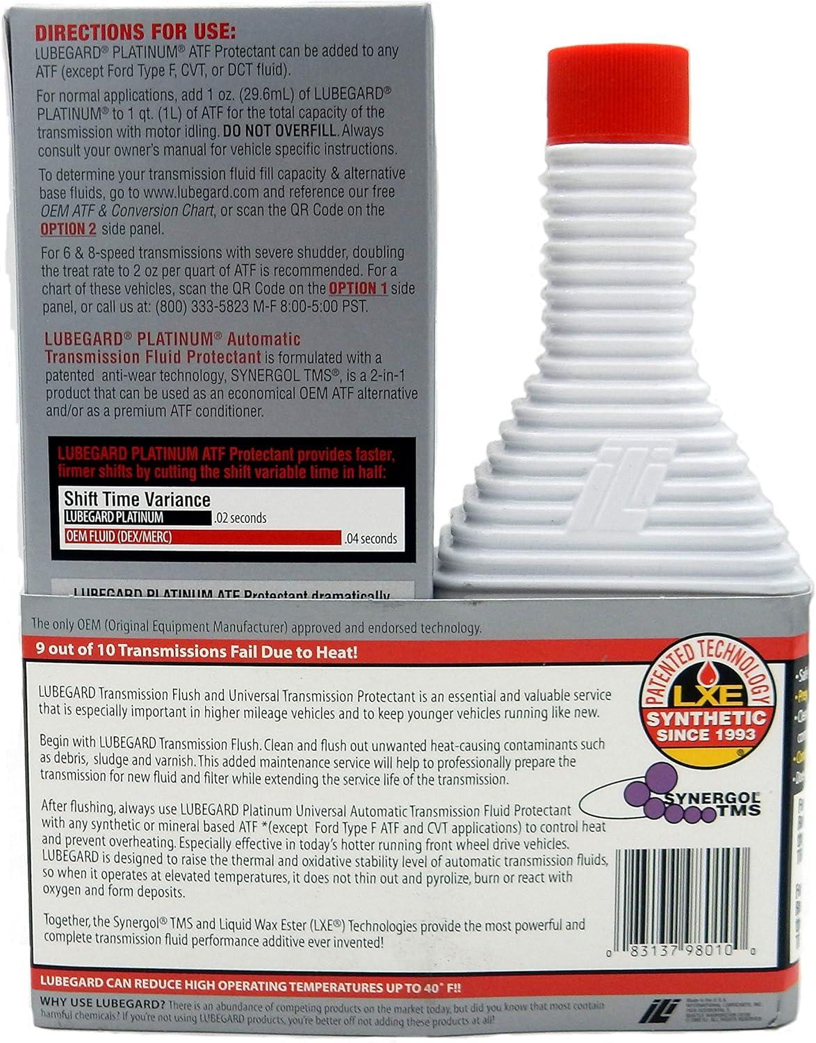 Lubegard Platinum Universal ATF Flush and Protect Pack features the safest, most gentle transmission flush available. Other transmission flushes contain harmful solvents that can actually dissolve seals and gaskets. The Lubegard transmission flush is designed to gently flush away varnish, sludge, and other by-products and prepare your transmission for fresh fluid. The directions for use with the flush machine include following the manufacturers directions. The directions for use without the flush machine include adding one bottle of Lubegard automatic transmission flush to the transmission fluid. With the car on lift (or wheels above the ground) start the engine; circulate for 5 minutes cycling Lubegard automatic transmission flush through all gears. Then drain completely and refill with Dexron/Mercon ATF and one bottle of Lubegard platinum universal ATF protectant. The Lubegard platinum universal ATF protectant is uniquely formulated using the patented synthetic LXE (liquid wax ester) technology and new synthetic synergol TMS technology. Together, these technologies provide the most advanced and complete transmission fluid performance service additive ever invented. It is used to convert regular Dexron/Mercon ATF into OEM types and perform like MERCON V ATF, highly friction modified ATFs, such as: Honda Genuine ATF, Toyota Type T, Toyota Type TII, Toyota Type TIV, Mopar ATF + 3 (7176), Mopar ATF +4 (9602), and all other highly friction modified ATFs.